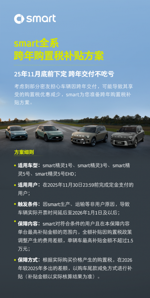 即日起,选购smart #1、#3、#5、#5 EHD超级电混车型,并在2025年11月30日(含)前完成定金支付的用户,如因非用户原因导致车辆实际开票时间延后至2026年1月1日及以后的,smart将在最高额补贴范围内全额补贴因购置税政策调整产生的费用差额,单辆车最高补贴金额不超过1.5万元。
